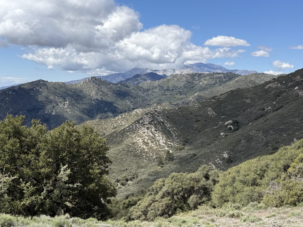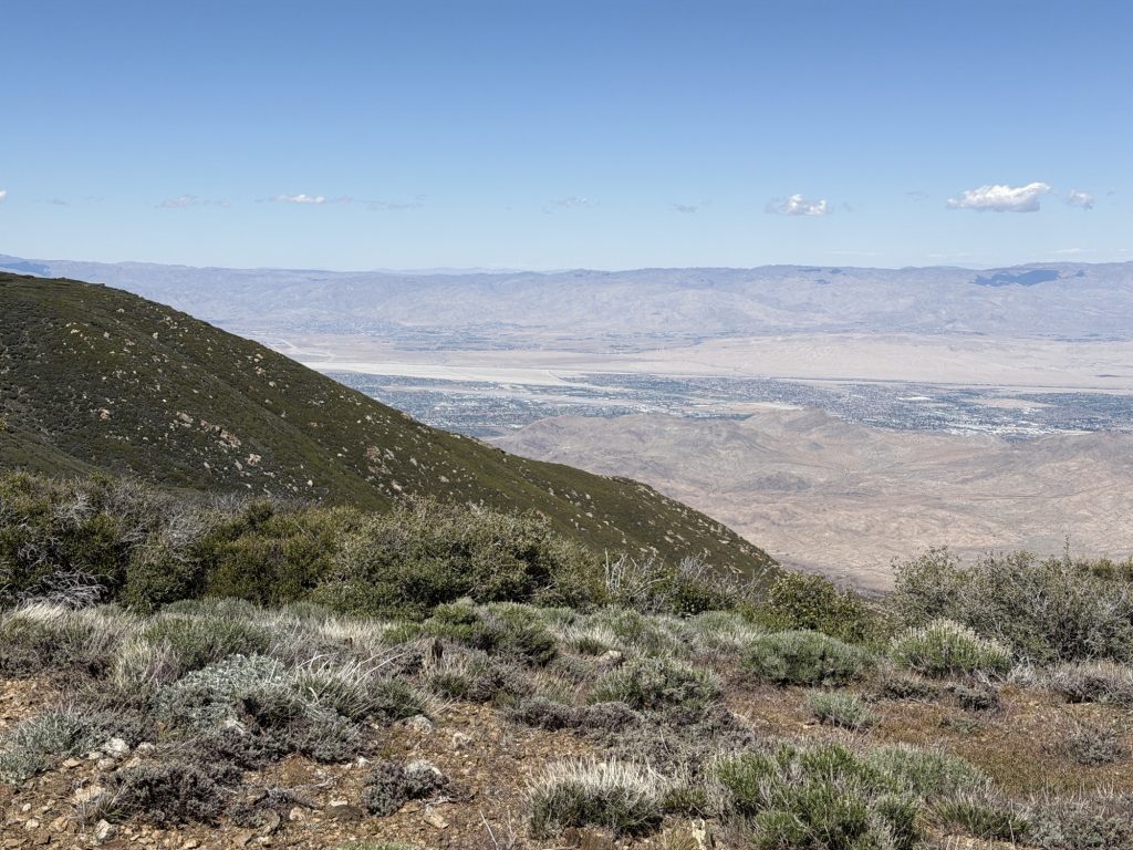 Here along the ridge on the left everything is green and to the right everything is brown and you can see into Coachella valley. At some point I passed the spot where I sprained my ankle in 2018 and eventually passed the spot where I hobbled off the ridge to hitch hike into town. So now I’m on parts of the PCT I’ve never seen. There were beautiful views of Mount San Jacinto and the valley bellow.