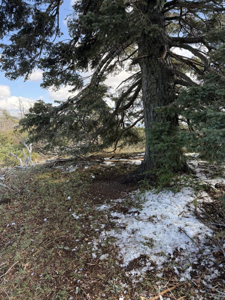 It snowed up here over the last two days but almost all has melted. I passed some trees that were raining ice that has built up during the storms. I decided to gather a bunch just in case I’m wrong in my water calculation!