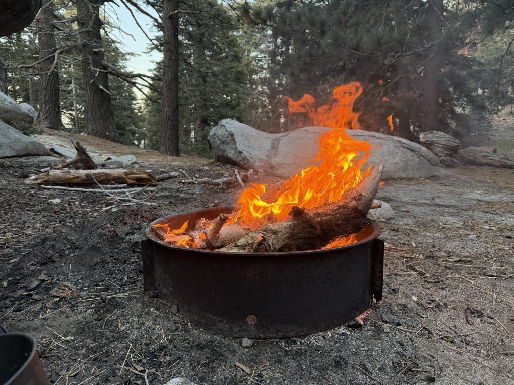 I met up with a group of hikers who have dubbed themselves the Coyote pack. They named themselves es thus because apparently coyotes often go off on their own and rejoin. Which is fitting for how a trail family works. I made camp with them tonight and they are an interesting group including a paramedic from France. Were at a designated camp site that has a fire ring so someone started a campfire Which is an unusual occurrence on the PCT. It’s cold tonight – low of 4 degrees here at 8000 ft and two of them are cowboy camping. Hopefully the fire keeps them warm.