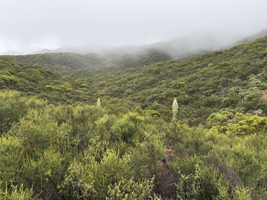 Because I knew it was going to be cooler and cloudy I slept in today and started hiking at 0715 instead Of 0600-0630. I know I shouldn’t be so kind to myself. There isn’t much water on this stretch so I’m quite happy with the cooler temperature (high of 10 celcious). The forecast was calling for a 30% chance of rain totaling about 3mm. This is part of a much larger weather system bringing a non insignificant and much needed snow in the sierras.